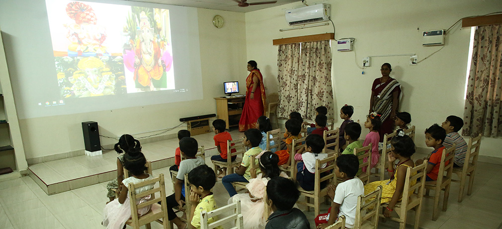 An exclusive air-conditioned theatre is used for featuring animated devotional films. Children enjoy watching Little Krishna, Jai Hanuman, Bal Ganesh and General Conversation through Power Point Presentations.